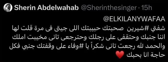وكتبت شيرين عبد الوهاب عبر حسابها على منصة «إكس»: "شفتي شيرين صحبتك حبيبتك اللي جيتي في مرة قلت لها إننا جنبك وحتقفي على رجليك و ترجعي تاني مخيبتِ أملك والحمد لله رجعت تاني. شكراً يا وفاء على وقفتك جنبي في كل حاجة، أنا بحبك".