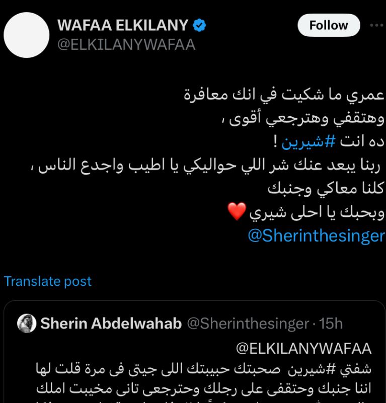 وردت وفاء الكيلاني، علي بوست شيرين عبد الوهاب، على حسابها على "إكس"، قائلة: «عمري ما شكيت في أنك معافرة، وهتقفي وهترجعي أقوى، ده أنت شيرين، ربنا يبعد عنك شر اللي حواليكي يا أطيب وأجدع الناس، كلنا معاكي وجنبك وبحبك يا أحلى شيري».