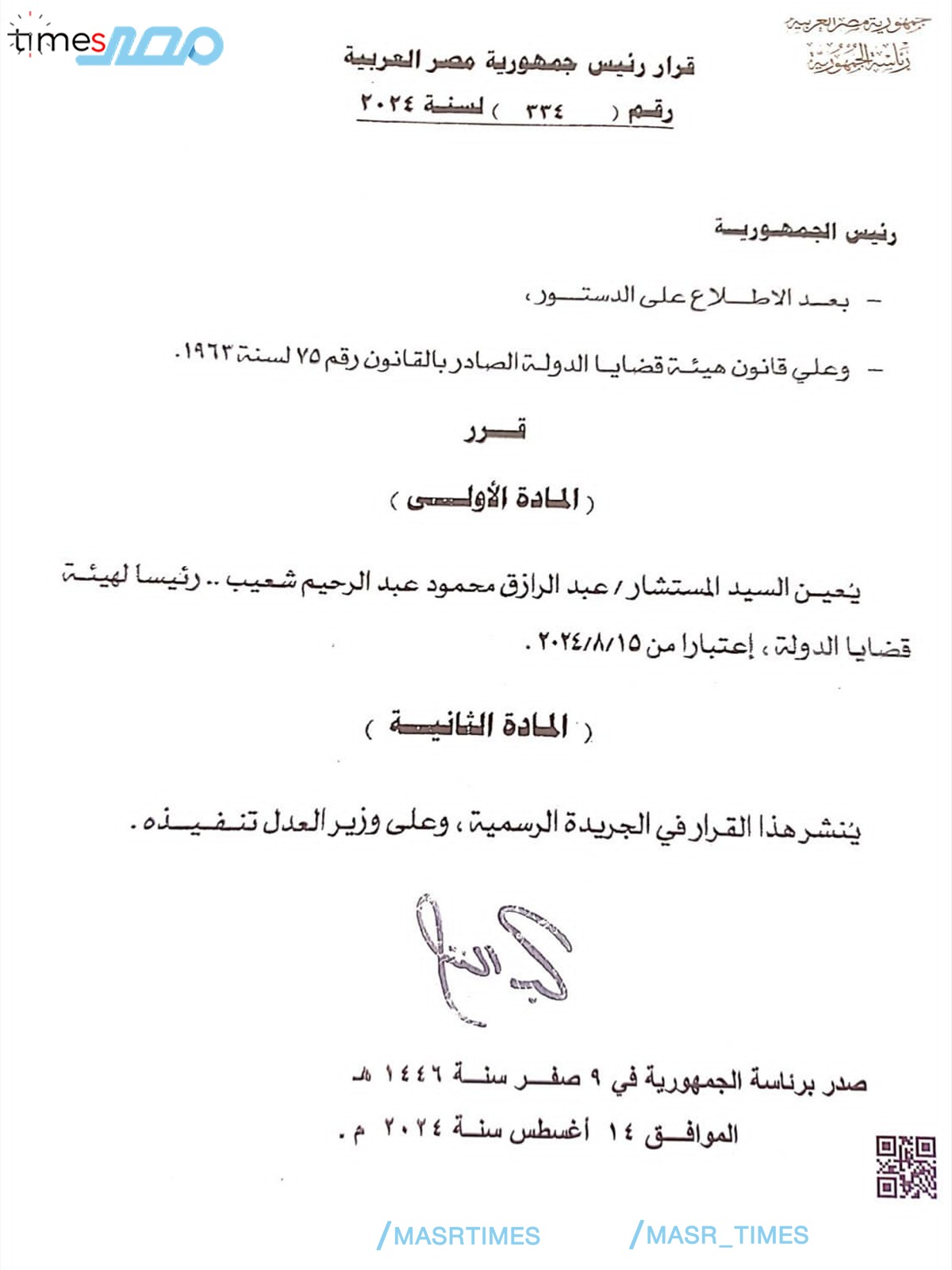قرار جمهوري بتعيين المستشار عبدالرازق شعيب رئيسا لهيئة قضايا الدولة (مستند)