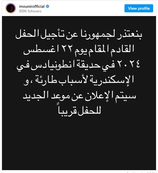 ونشر الفنان محمد منير، اعتذارًا عن إقامة الحفل، عبر حسابه الشخصي «انستجرام» قائلًا: «بنعتذر لجمهورنا عن تأجيل الحفل القادم يوم 22 أغسطس2024، بحديقة أنطونيادس في الاسكندرية لأسباب طارئة، وسيتم الإعلان عن موعد جديد للحفل قريبًا».
