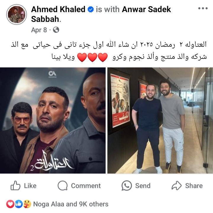 وكتب أحمد خالد عبر حسابه الرسمي بموقع التواصل الإجتماعى "فيس بوك": «العتاوله 2 رمضان 2025، أن شاء الله اول جزء تانى في حياتى مع الذ شركه والذ منتج وألذ نجوم وكرو، ويلا بينا.