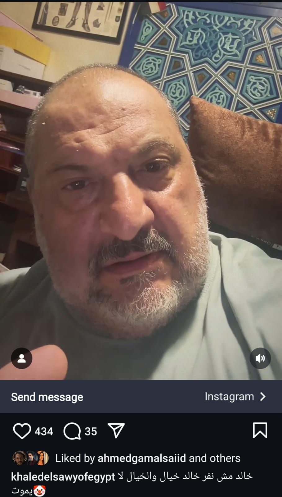 واختتم : "وثقوا يا جماعة إن أنا لو مت هكون أول واحد يطلع يقول خالد الصاوي مات"