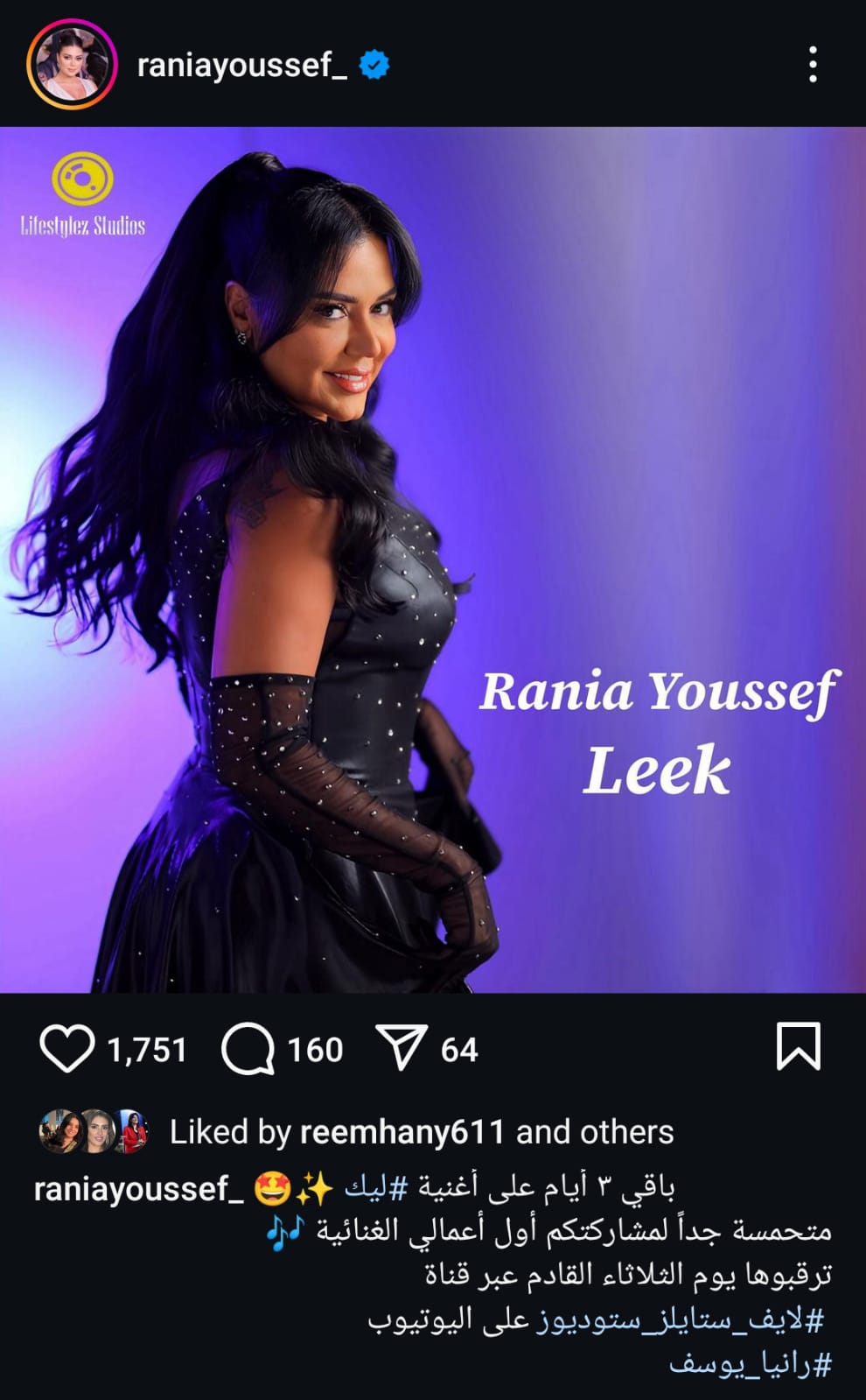 تستعد الفنانة رانيا يوسف لطرح أغنيتها الجديدة والتي تحمل اسم"ليك" الثلاثاء المقبل عبر وسائل التواصل الاجتماعي، حيث بدأت رانيا يوسف خلال الساعات الماضية الترويج للأغنية.
