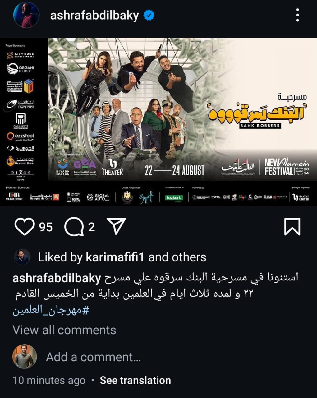 جدير بالذكر، روجت الصفحة الرسمية لمهرجان العلمين على موقع التواصل الاجتماعي فيس بوك على لمسرحية البنك سرقوه للنجم اشرف عبد الباقي والمقرر عرضها ضمن فاعليات مهرجان العلمين في نسخته الثانية.