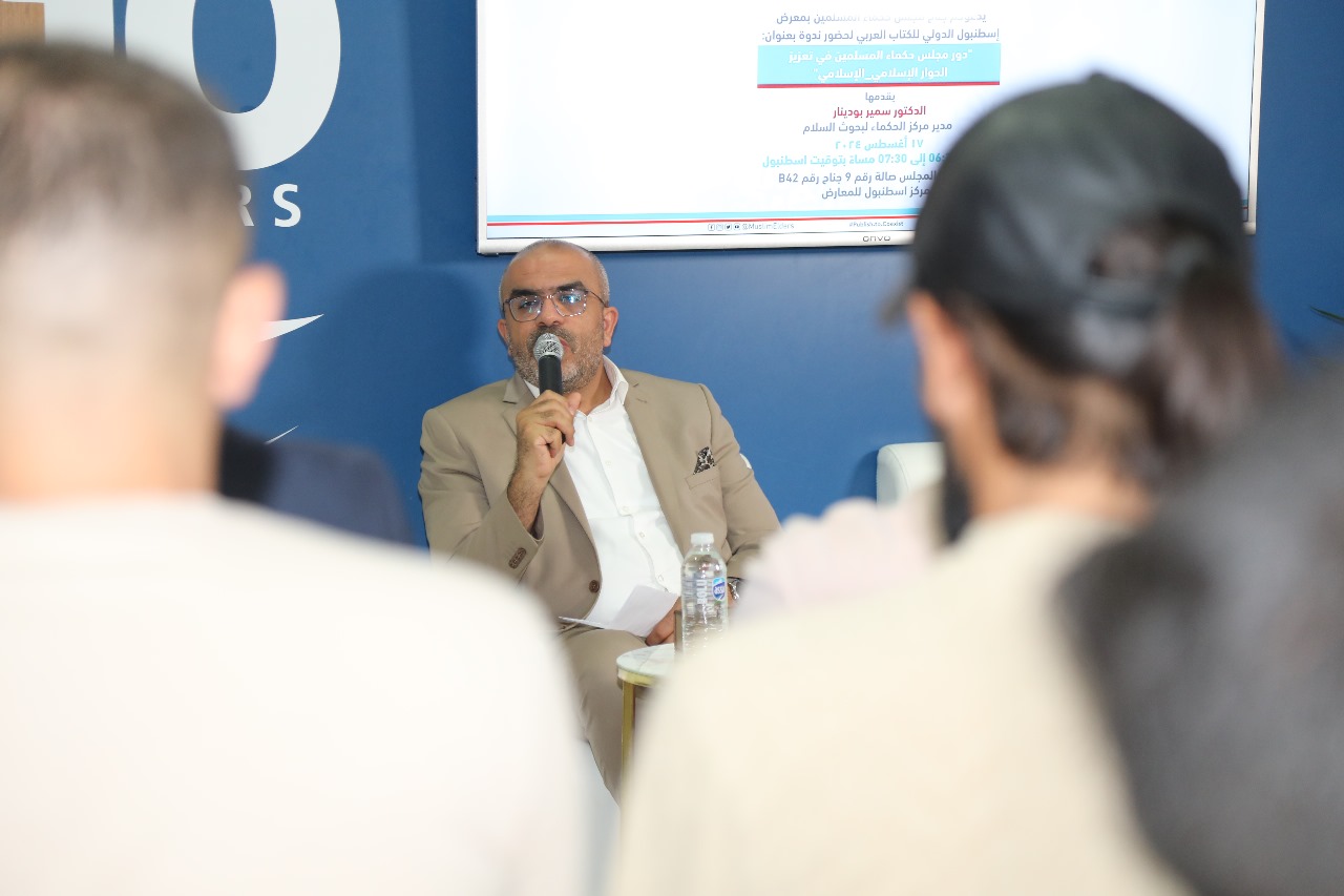 نظَّم جناح مجلس حكماء المسلمين بمعرض إسطنبول الدولي للكتاب العربي، ندوة ثقافية بعنوان: "دور مجلس حكماء المسلمين في تعزيز الحوار الإسلامي-الإسلامي" قدمها د. سمير بودينار، مدير مركز الحكماء لبحوث السلام؛ حيث ناقشت الندوة عددًا من المحاور منها سُبُل تعزيز التواصل والتفاهم بين مكونات الأمة الإسلامية، والتحديات التي تواجه العالم الإسلامي في الوقت الحاضر، التي تتطلب توحيد جهود أبنائه والابتعاد عن كل أسباب الخلاف والصراع والفرقة.