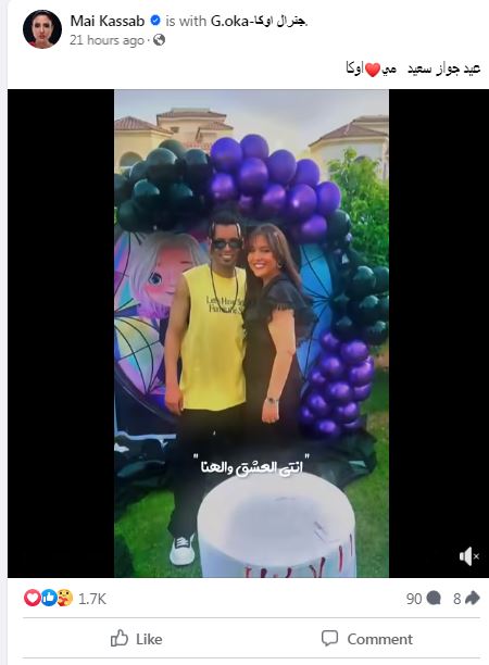 احتفلت الفنانة مى كساب بعيد زواجها التاسع من زوجها المغنى محمد صلاح الشهير بـ أوكا بعيد زواجهما التاسع وسط أجواء رومانسية.