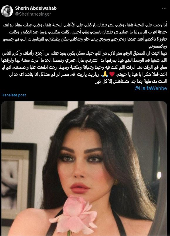 وجهت النجمة شيرين عبد الوهاب رسالة حب وتقدير للنجمة هيفاء وهبي عبر صفحتها الرسمية" x" ، عن مساعدتها ودعمها في أزمتها الأخيرة .