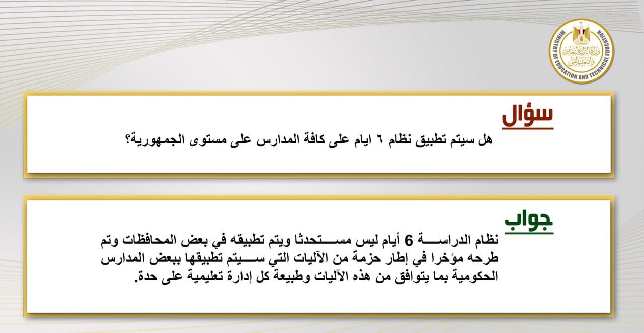 وزارة التربية والتعليم والتعليم الفني تقدم توضيحا للأسئلة الأكثر تداولا حول إعادة هيكلة المرحلة الثانوية والمواد غير المضافة للمجموع وعدد أيام الدراسة في المدارس