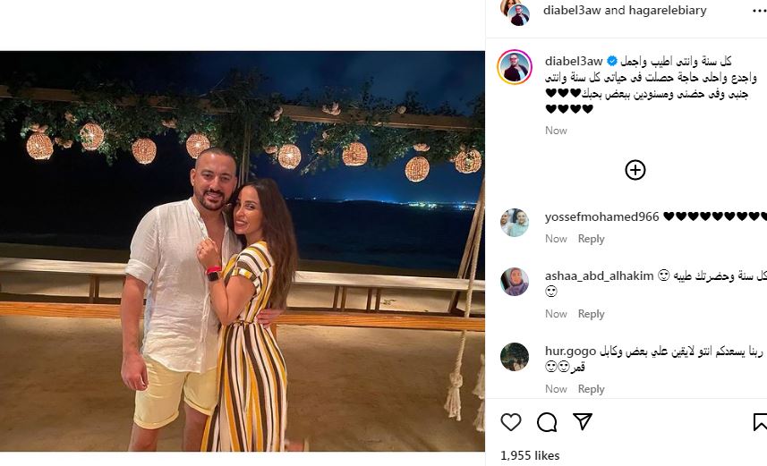 ونشر دياب، صورة تجمعه بزوجته، عبر صفحته «انستجرام» وعلق عليها: «كل سنة وأنت أطيب وأجمل وأجدع وأحلى حاجة حصلت في حياتي كل سنة وأنتي جنبي وفي حضني و مسنودين ببعض بحبك».