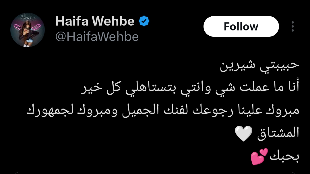 وعلقت هيفاء وهبي قائلة : "حبيبتي شيرين أنا ما عملت شئ وأنتي تستاهلي كل خير، ومبروك علينا رجوعك لفنك الجميل ومبروك لجمهورك المشتاق، بحبك".