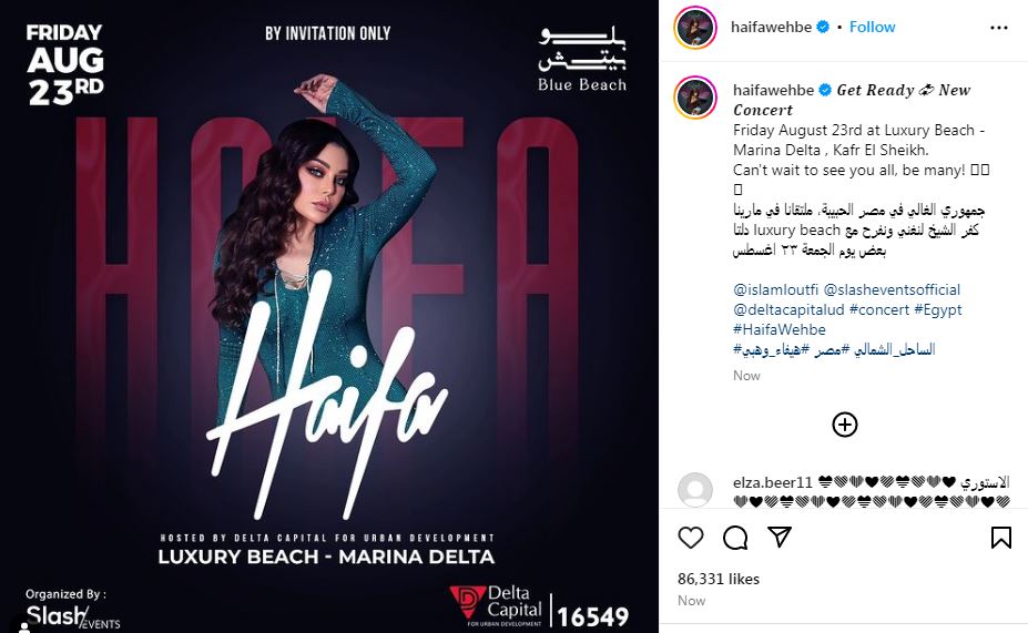 ونشرت هيفاء وهبي عبر حسابها على موقع التواصل الاجتماعي "إنستجرام"، بوستر الحفل، وعلقت: «جمهوري الغالي في مصر الحبيبة، ملتقانا في مارينا دلتا luxury beach كفر الشيخ لنغني ونفرح مع بعض يوم الجمعة 23 أغسطس».