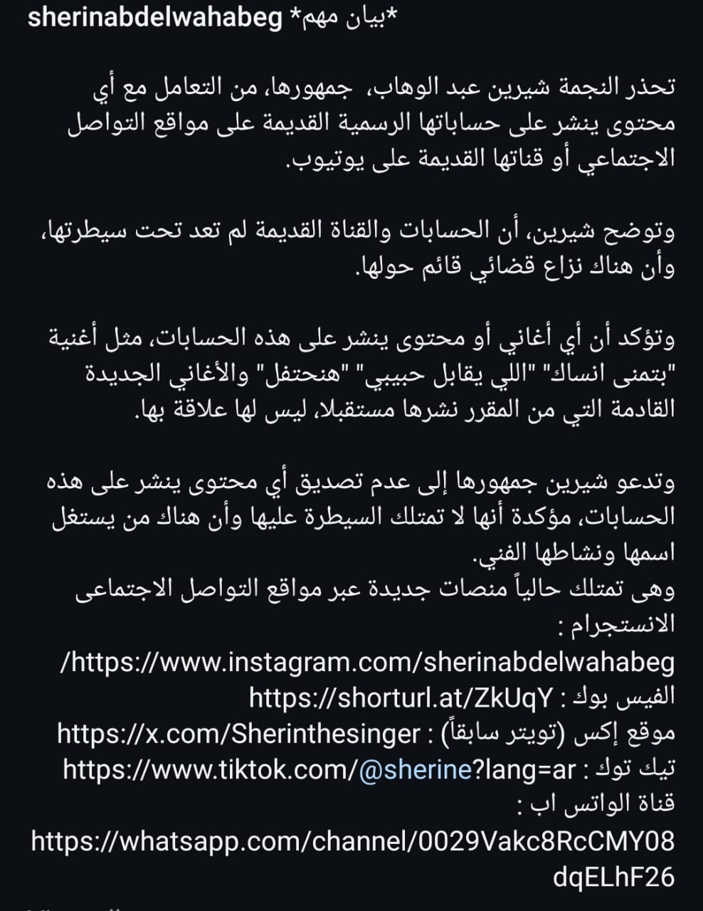 حذرت الفنانة شيرين عبد الوهاب جمهورها من التعامل مع صفحاتها الرسنمية القديمة عبر وسائل التواصل الاجتماعي وذلك من خلال بيان أصدرته على صفحتها الرسمية عبر موقع تبادل الصور والفيديوهات "إنستجرام".