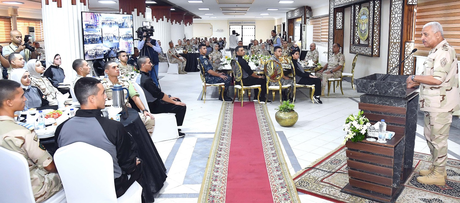 كما قدم القائد العام التهنئة لطلبة القسم النهائى على قرب تخرجهم متمنياً لهم التوفيق فى حياتهم العملية ، موجهاً الشكر للقائمين والمشرفين على إختبارات القبول للدفعات الجديدة بالأكاديمية لإتباعهم كافة الإجراءات والأساليب العلمية المتطورة التى تمكن من تحقيق مبدأ المساواة والشفافية والنزاهة للإنتقاء الدقيق لأفضل العناصر المتقدمة للإنضمام إلى صفوف القوات المسلحة .