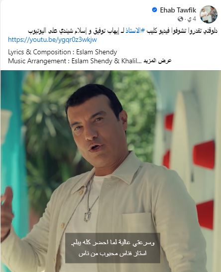 ونشر إيهاب توفيق، عبر صفحته الشخصية على موقع "فيس بوك"، مقطع من فيديو كليب أغنيته الجديدة "الاستاذ"، وعلق قائلا: "دلوقتي تقدروا تشوفوا فيديو كليب الأستاذ، لإيهاب توفيق و اسلام شيندي، على يوتيوب".