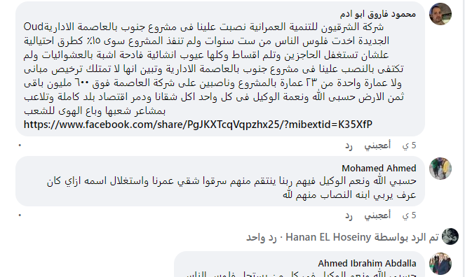 وقال محمود فاروق أحد المتضررين،" Oudشركة الشرقيون للتنمية العمرانية نصبت علينا فى مشروع جنوب بالعاصمة الادارية الجديدة اخدت فلوس الناس من ست سنوات ولم تنفذ المشروع سوى 15 ٪ كطرق احتيالية علشان تستغفل الحاجزين وتلم اقساط وكلها عيوب انشائية فادحة اشبة بالعشوائيات ولم تكتفى بالنصب علينا فى مشروع جنوب بالعاصمة الادارية وتبين انها لا تمتلك ترخيص مبانى ولا عمارة واحدة من 23 عمارة بالمشروع وناصبين على شركة العاصمة فوق 600 مليون باقى ثمن الارض حسبى الله ونعمة الوكيل فى كل واحد اكل شقانا ودمر اقتصاد بلد كاملة وتلاعب بمشاعر شعبها وباع الهوى للشعب".
