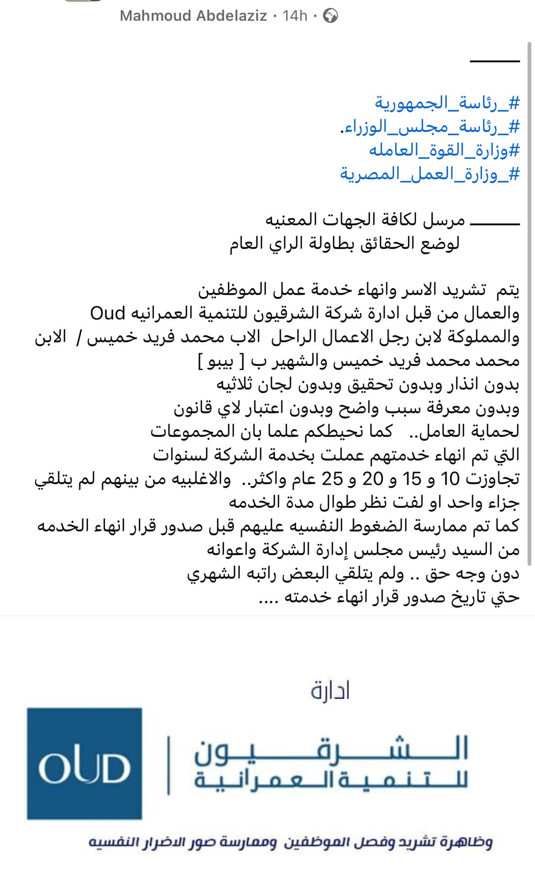 وقال أحد العاملين،: يتم تشريد الاسر وانهاء خدمة عمل الموظفين والعمال من قبل ادارة شركة الشرقيون للتنمية العمرانية Oud والمملوكة لابن رجل الاعمال الراحل الاب محمد فريد خميس / الابن محمد محمد فريد خميس والشهير ب [ بيبو ] بدون انذار وبدون تحقيق وبدون لجان ثلاثيه وبدون معرفة سبب واضح وبدون اعتبار لاي قانون لحماية العامل.