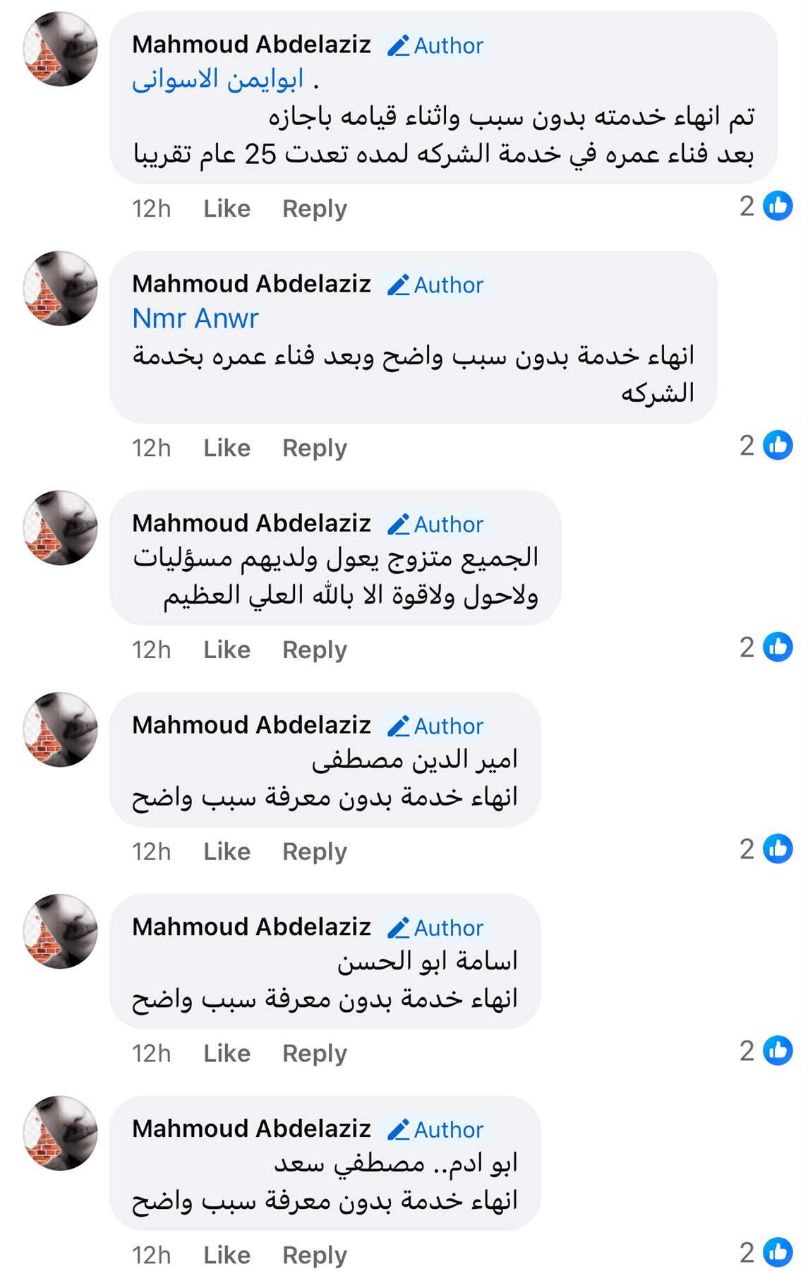 وتابع:" كما نحيطكم علما بان المجموعات التي تم انهاء خدمتهم عملت بخدمة الشركة لسنوات تجاوزت 10 و 15 و 20 و 25 عام واكثر.. والاغلبيه من بينهم لم يتلقي جزاء واحد او لفت نظر طوال مدة الخدمة كما تم ممارسة الضغوط النفسيه عليهم قبل صدور قرار انهاء الخدمه من السيد رئيس مجلس إدارة الشركة واعوانه دون وجه حق .. ولم يتلقي البعض راتبه الشهري حتي تاريخ صدور قرار انهاء خدمته".