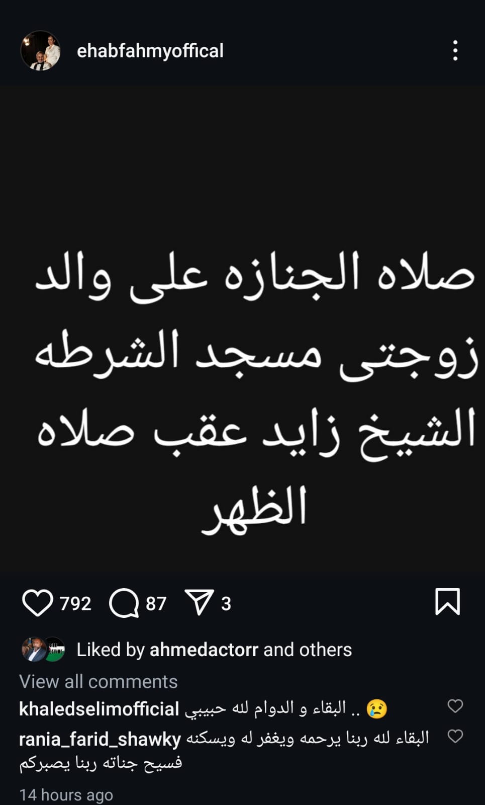 ايهاب فهمي.. كما أعلن أيضا ايهاب فهمي عن موعد ومكان تشييع جنازة والد زوجته وذلك عندما كتب على صفحته الرسمية عبر موقع تبادل الصور والفيديوهات "إنستجرام" وعلق قائلا : "صلاة الجنازة على والد زوجتي بمسجد الشرطة الشيخ زايد عقب صلاة الظهر".
