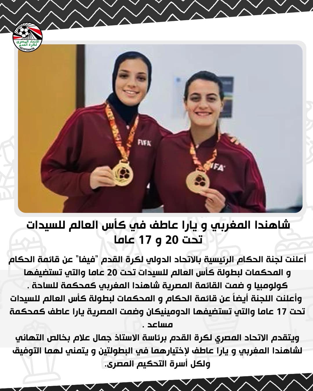 ويتقدم الاتحاد المصري لكرة القدم برئاسة الاستاذ جمال علام بخالص التهاني لشاهندا المغربي و يارا عاطف لإختيارهما في البطولتين و يتمني لهما التوفيق ولكل أسرة التحكيم المصرى.