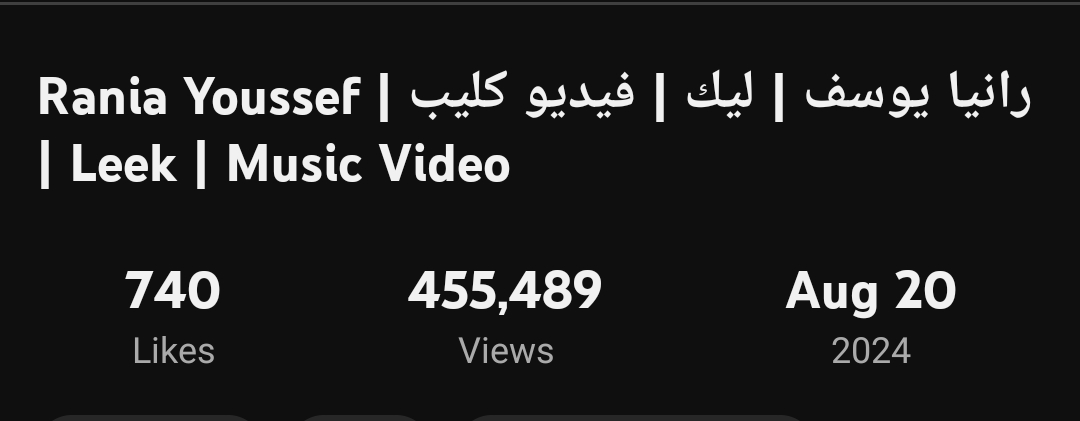 طرحت الفنانة رانيا يوسف خلال الساعات الماضية أغنيتها الجديدة "ليك" والتي تعد أول تجربة غنائية لها عبر موقع الفيديوهات "يوتيوب" وجميع وسائل التواصل الاجتماعي، حيث اقتربت الأغنية من النصف مليون مشاهدة وذلك عندما حصدت الأغنية 455,489 مشاهدة على اليوتيوب خلال 24 ساعة من طرحها.