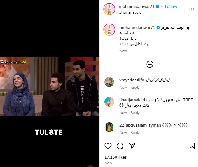 نشر محمد أنور، عبر حسابه على موقع التواصل الاجتماعي «إنستجرام»، مقطع فيديو من لقاء قديمة، هو وعلي ربيع وساره درزاوي مع الفنان أشرف عبد الباقي، وعلق مازحا : «جه الوقت اللي تعرفو فيه الحقيقة أنا TUL8TE، وده الدليل من 2011».