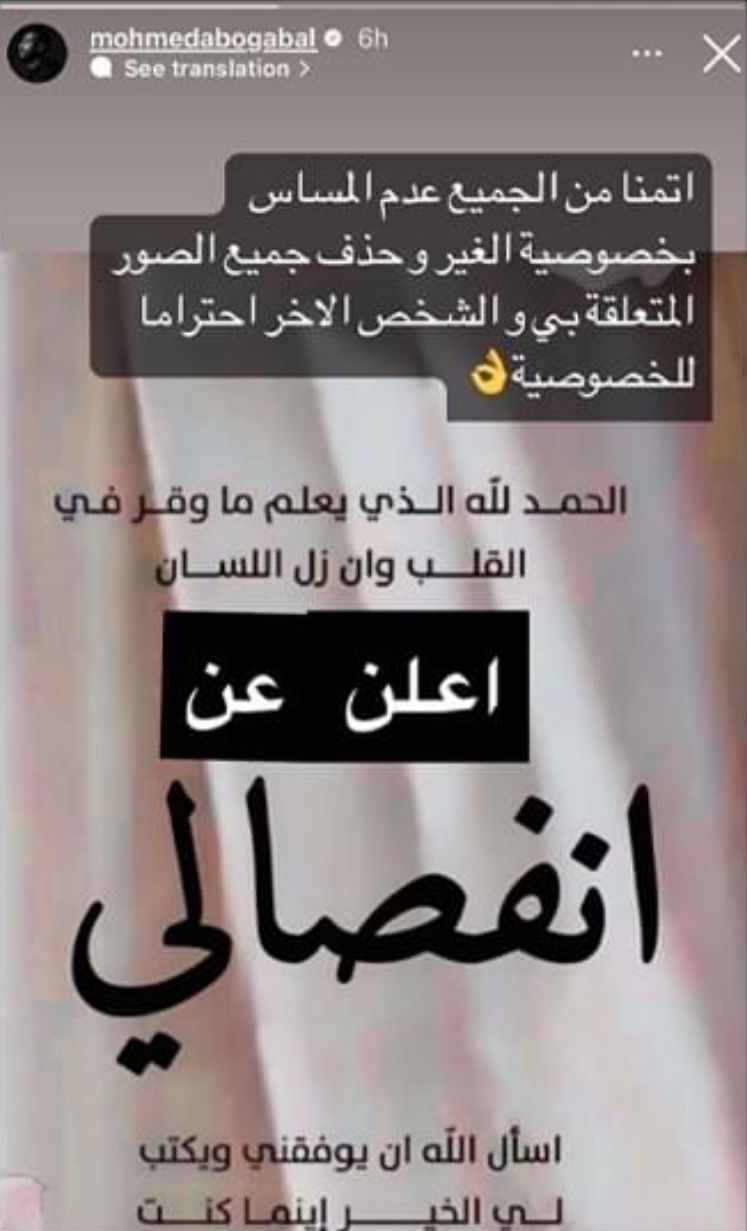 ونشر أبو جبل "ستوري" عبر حسابه الشخصي على مواقع التواصل الاجتماعي على "انستجرام" قائلًا: "أتمنى من الجميع عدم المساس بخصوصية الغير وحذف جميع الصور المتعلقة بي والشخص الآخر احتراما للخصوصية".