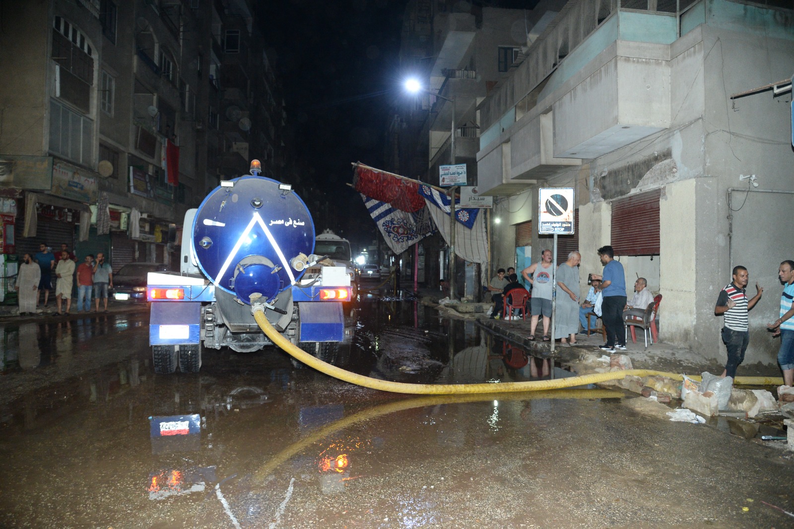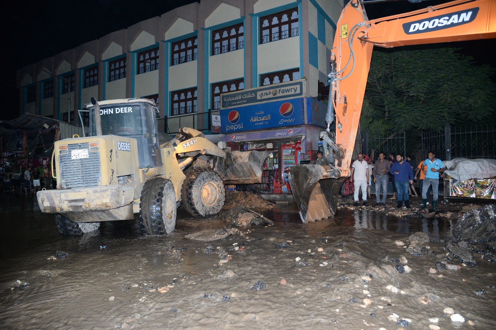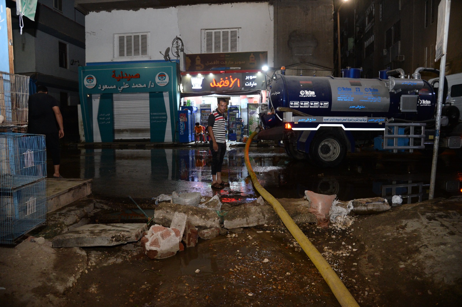 فقد قام أبوالنصر، بالتوجه إلى موقع البلاغ أثناء جولته الميدانية ليلاً، ووجه على الفور وحدة الإنقاذ السريع بالانتقال إلى موقع البلاغ وكذلك بالاستعانة بجميع سيارات كسح المياة من المراكز والمدند والاحياء وتوجيهها إلى موقع البلاغ، وقد تمت أعمال رفع المياة من الجراجات والبدرومات والمخازن بالبنايات السكنية التي تدفقت إليها المياه بالمنطقة، وباشرت فرق الصيانة أعمالها فى وقت متأخر من الليل مع تواجد طوارئ الغاز والكهرباء والتليفونات لعمل اللازم بالموقع .