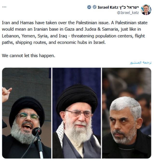 وكتب كاتس "تغريدة" عبر حسابه الرسمي في منصة "إكس": "لقد سيطرت إيران وحماس على القضية الفلسطينية".