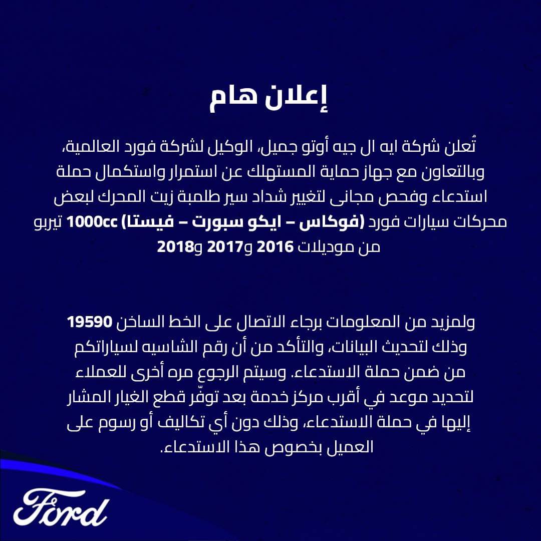 تُعلن شركة ايه ال جيه أوتو جميل - الوكيل لشركة فورد العالمية عن استمرار واستكمال حملة إستدعاء وفحص مجاني لتغيير شداد سير طلمبة زيت المحرك، لبعض محركات سيارات فورد (فوكاس - ايكو سبورت - فيستا) cc 1000 تيربو من موديلات (2016 - 2017 - 2018).