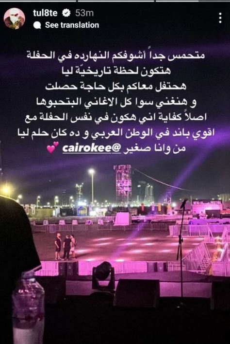 حرص المطرب المقنع توليت على الترويج لحفلته الليلة، في مهرجان العلمين من خلال منشور له عبر خاصية الاستوري بحسابه الرسمي بموقع التواصل الاجتماعي انستجرام قائلاَ: «متحمس جدًا أشوفكم النهاردة في الحفل.. هتكون لحظة تاريخية ليا.. هحتفل معاكم بكل حاجة حصلت وهنغني سوا كل الأغاني اللي بتحبوها.. أصلًا كفاية إني هكون في نفس الحفل مع أقوى باند في الوطن العربي وده كان حلم ليا ومن أنا صغير ..كاريوكي».
