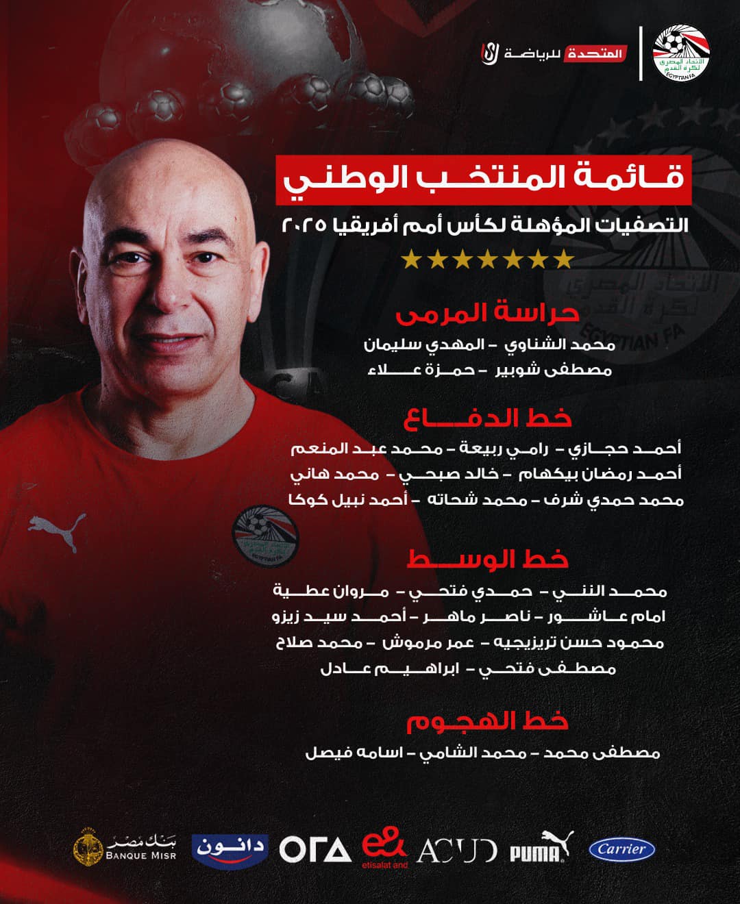 أعلن الجهاز الفني لمنتخب مصر الأول لكرة القدم بقيادة حسام حسن قائمة الفريق وتضم 27 لاعباً استعدادا للمعسكر المقرر انطلاقه 28 أغسطس الجاري حتى 10 سبتمبر ويتخلله مباراتي كاب فيردي و بتسوانا المقرر لهما يومي 6 و 10 سبتمبر في الجولة الاولى والثانية للتصفيات المؤهلة لنهائيات كأس الأمم الافريقية 2025 بالمغرب.