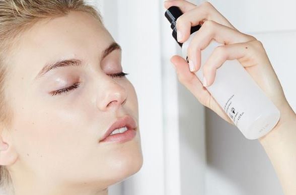 ٢-رجي الزجاجة جيداً و اغلقي عينيك، ثم رشي سبراي مثبت المكياج من مسافة 50 سم على وجهك بالكامل.