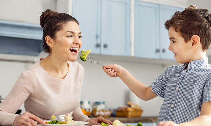لن يلتزم طفلك بالطعام الصحي إذا لم تكوني قدوة له، فالطفل يستمع لنصائحك عن الطعام الصحي بينما يشاهدكِ تتناولين الوجبات السريعة، وبالتالي لن يقتنع، لهذا ادمجي نظامك الغذائي مع طفلك، واعتمدي على الخيارات الصحية في طعامكِ أنتِ أيضاً.