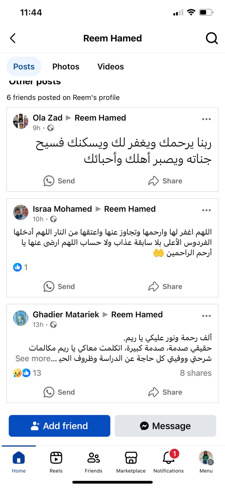 وخلال الساعات الماضية، شارك بعض مستخدمي منصة فيسبوك حساب الباحثة ريم حامد، زاعمين بـ خبر وفاتها: ربنا يرحمك ويغفر لك ويسكنك فسيح جناته ويصبر أهلك وأحبائك.