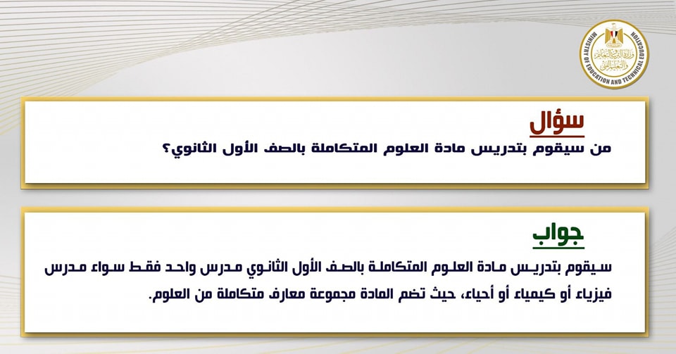 من سيقوم بتدريس مادة العلوم المتكاملة بالصف الاول الثانوي؟