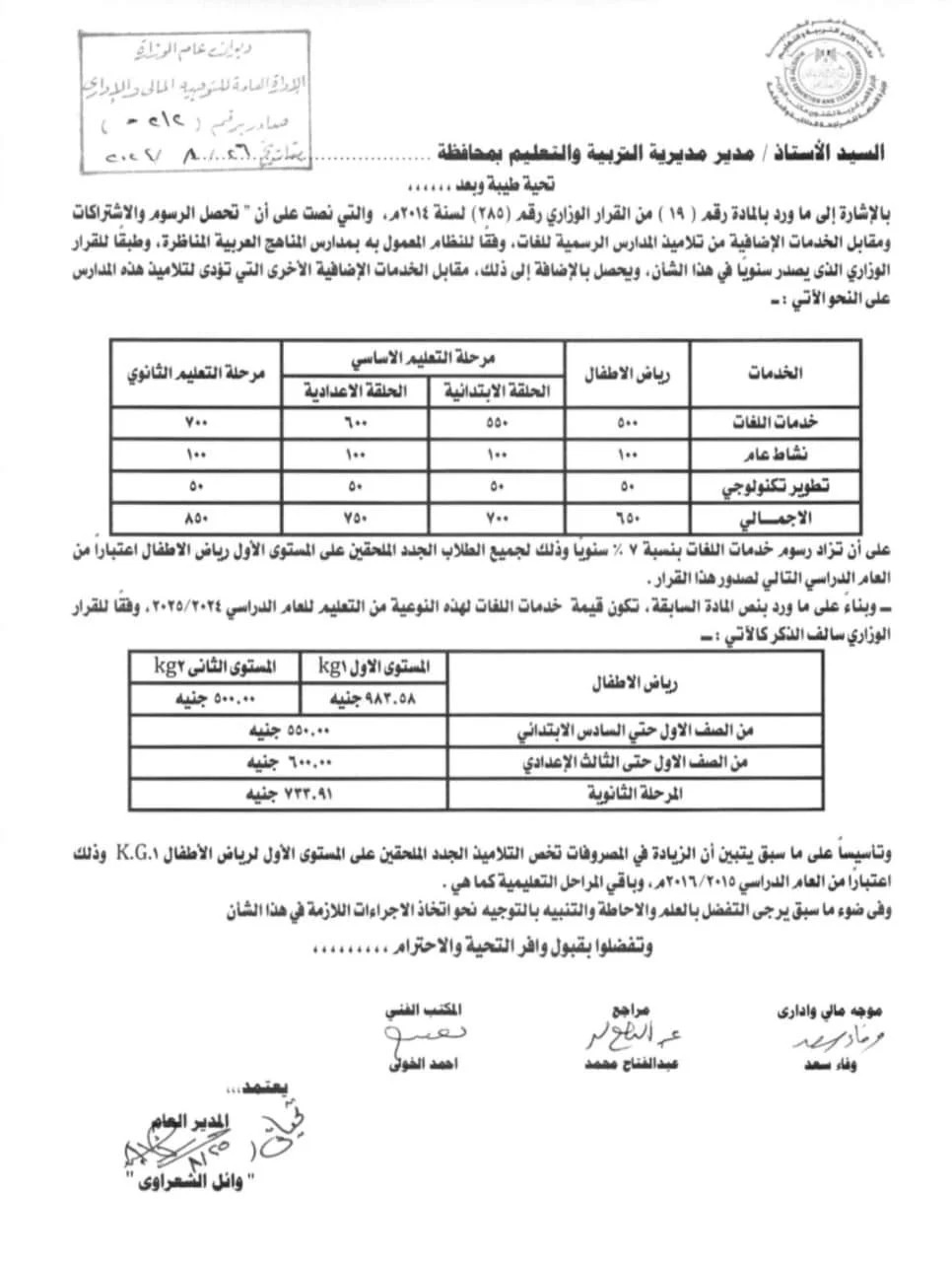 أرسلت وزارة التربية والتعليم والتعليم الفني، خطابا إلى مديري مديريات التربية والتعليم بجميع المحافظات بشأن مصروفات المدارس الرسمية لغات للعام الدراسي المقبل 2025.