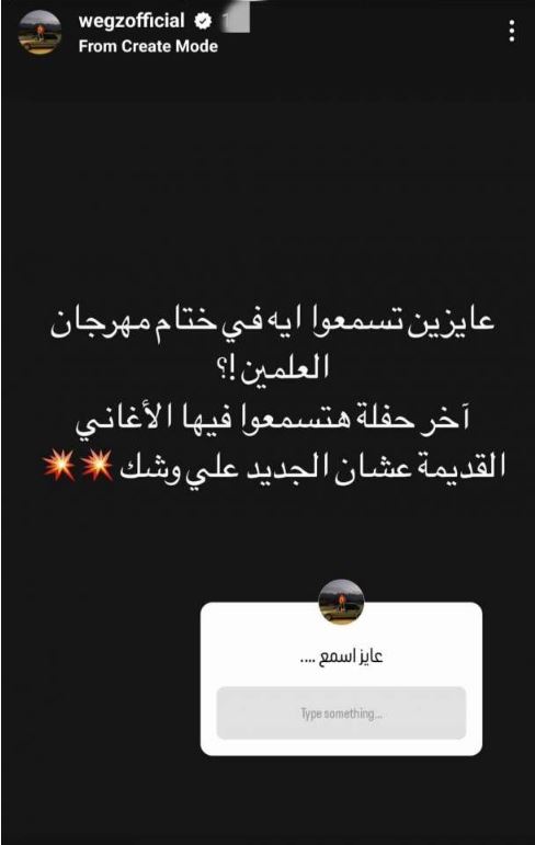 ونشر ويجز ستوري وكتب «عايزين تسمعوا ايه في ختام مهرجان العلمين: «آخر حفلة هتسمعوا فيها الأغاني القديمة عشان الجديد على وشك».