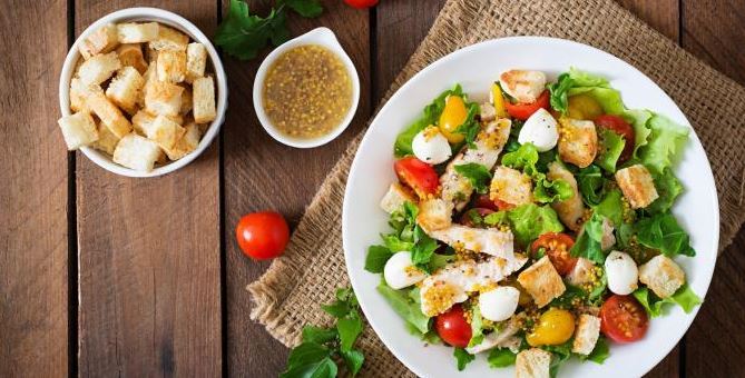 سلطة الدجاج: يمكن صنع سلطة الدجاج الغنية بالألياف لاحتوائها على الحبوب، وهو ما يزيد من الشعور بالامتلاء، وتحتوي هذه السلطة على 3 ملاعق من الكينوا أو الأرز الأسمر ونصف كوب من صلصة السمسم كوب من الخيار الصغير، وربع كوب من البقدونس المفروم وملعقتين كبيرتين من الشبت، ويُضاف إلى ذلك قطع الدجاج المشوية.