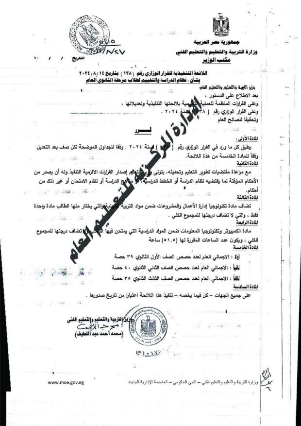 وأوضحت وزارة التربية والتعليم، في اللائحة التنفيذية للقرار الوزاري رقم 138 الخاص بنظام الدراسة والتقييم لطلاب المرحلة الثانوية عدد حصص لمادة تكنولوجيا المعلومات هي كالتالي: