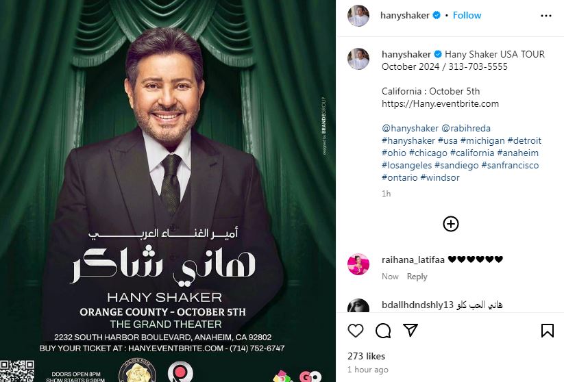 ونشر هاني شاكر صورة له روج من خلالها لحفله في الولايات المتحدة الأمريكية عبر حسابه الرسمي بموقع تداول الصور والفيديوهات "إنستجرام"، وعلق عليه قائلا: « 5 أكتوبر، جولة هاني شاكر في الولايات المتحدة الأمريكية".