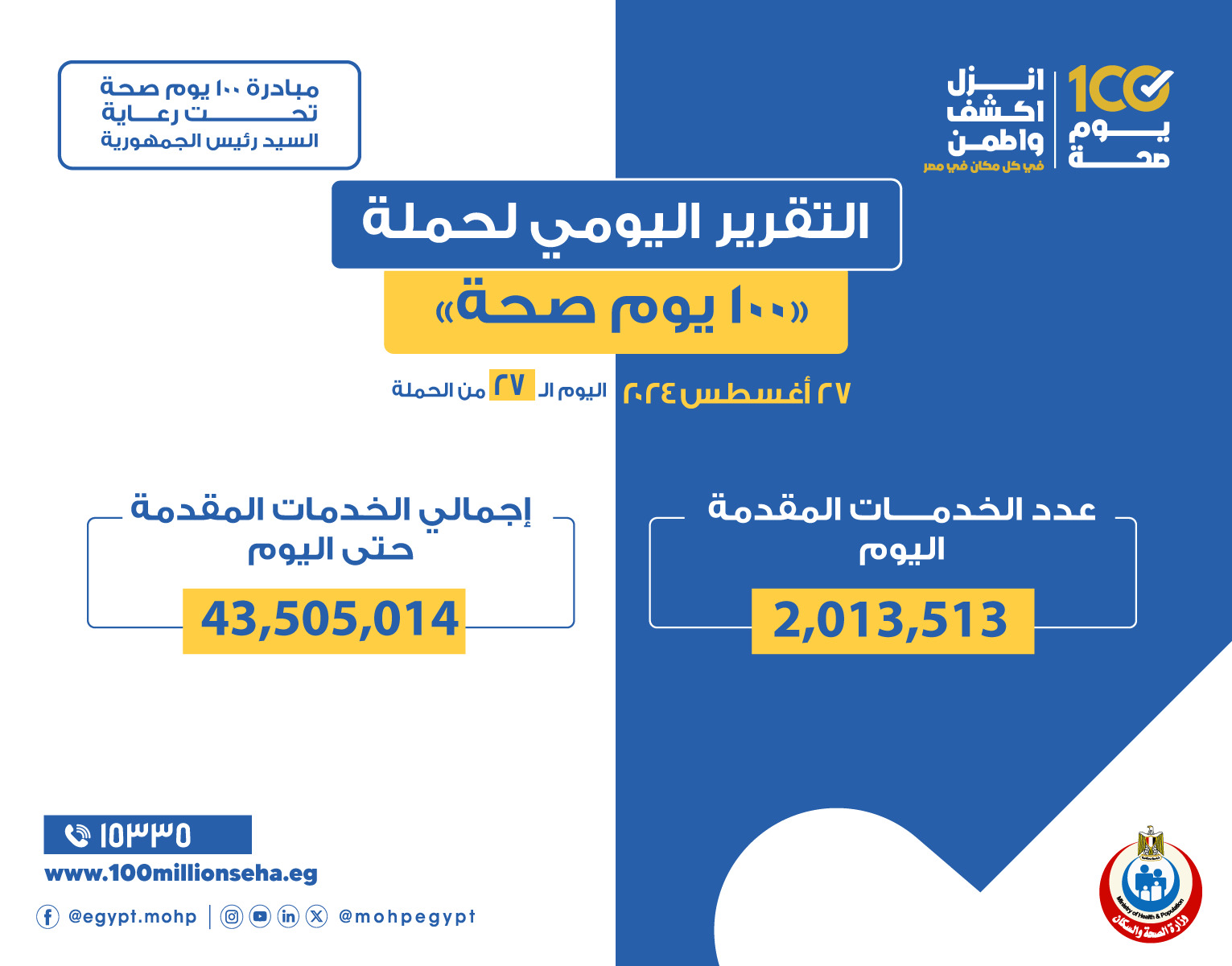 أعلن الدكتور خالد عبدالغفار نائب رئيس مجلس الوزراء ووزير الصحة والسكان، تقديم 43 مليون و505 آلاف و14 خدمة طبية من خلال حملة «100 يوم صحة» منذ إطلاق الدكتور مصطفى مدبولي رئيس مجلس الوزراء، للنسخة الثانية، مساء يوم 31 يوليو 2024، وحتى مساء أمس الثلاثاء 27 أغسطس، في جميع محافظات الجمهورية، برعاية السيد الرئيس عبدالفتاح السيسي.