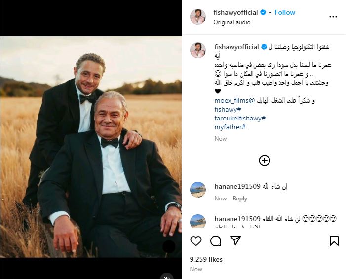 ونشر أحمد الفيشاوي عبر حسابه على موقع التواصل الاجتماعي "إنستجرام"، مقطع فيديو بالذكاء الاصطناعي يحتوي على صورة تجمعه مع والده الراحل فاروق الفيشاوي، وعلق: «عمرنا ما لبسنا بدل سوداء زي بعض في مناسبة واحدة، وعمرنا ما تصورنا في المكان دا سوا، وحشتني ياأجمل واحد وأطيب قلب، وأكرم خلق الله».