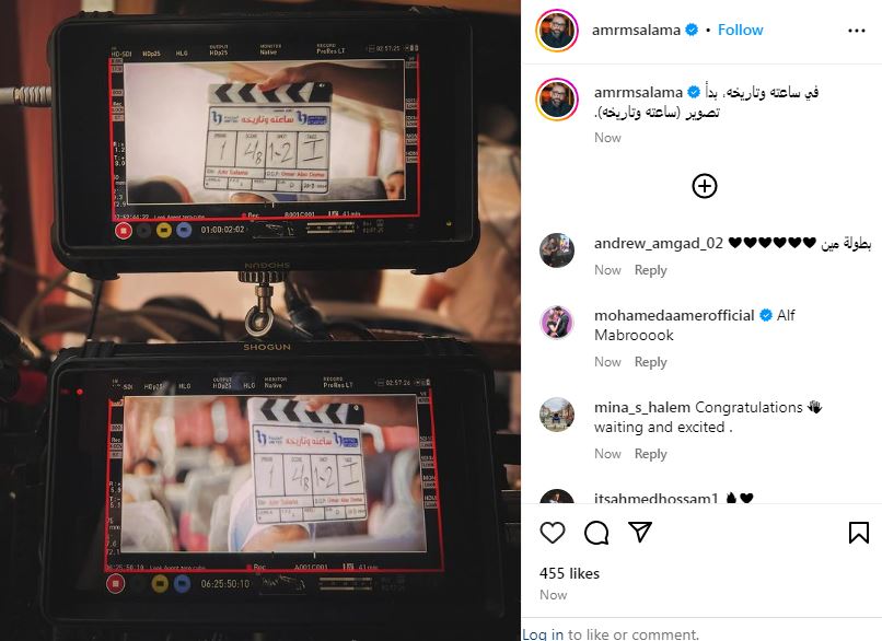 ونشر عمرو سلامة صورة عبر حسابه على «إنستجرام»، وعلق عليها: « في ساعته وتاريخه، بدأ تصوير ساعته وتاريخه».