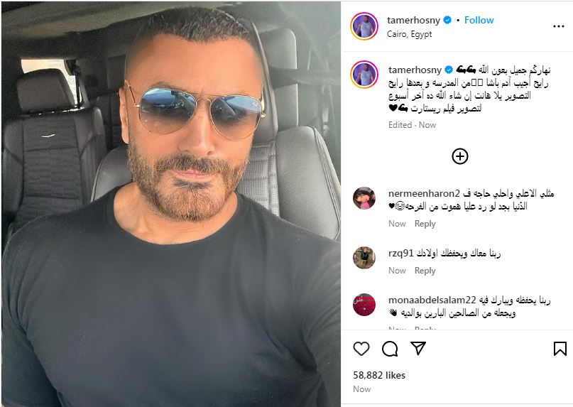 ونشر تامر حسني، صورة عبر حسابه الرسمي على «إنستجرام»، وعلق عليها: «نهاركُم جميل بعون الله، رايح أجيب آدم باشا، من المدرسة، وبعدها رايح التصوير يلا هانت إن شاء الله ده آخر أسبوع لتصوير فيلم ريستارت».