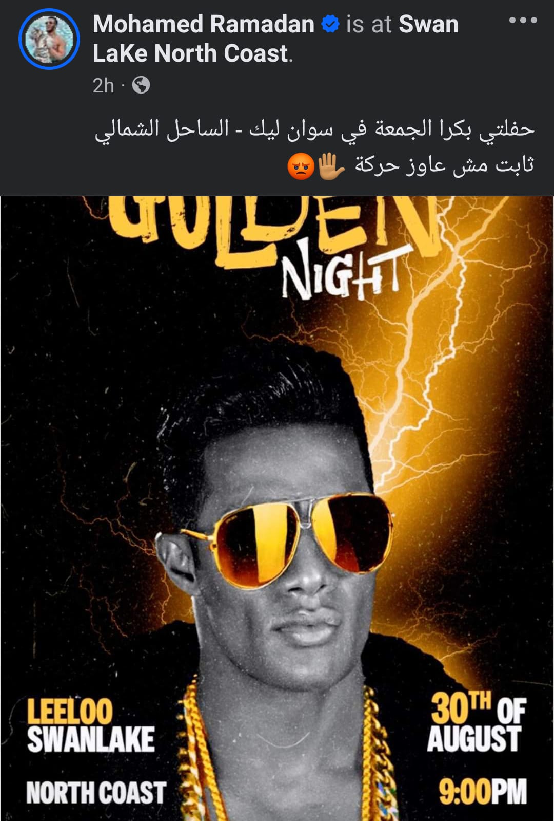نشر محمد رمضان صورة بوستر الحفل على صفحته الرسمية عبر موقع التواصل الاجتماعي "فيسبوك" وعلق قائلا : "حفلتي بكرة الجمعة في سوان ليك الساحل الشمالي، ثابت مش عاوز حركة" .