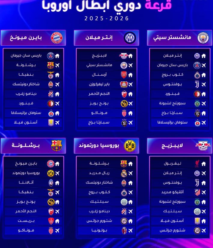 أقيمت مساء اليوم الخميس بمدينة موناكو الفرنسية ، فعاليات قرعة دوري أبطال أوروبا، بنظامه الجديد المستحدث في النسخة الحالية من البطولة القارية، والذي يشهد مشاركة 36 فريقًا للمرة الأولى في تاريخ المسابقة، على أن يخوض كل منهم 8 مباريات في دور المجموعات بدلًا من 6 مباريات وسيتم ترتيبهم بنظام الدوري، حيث أعلن الاتحاد الأوروبي لكرة القدم، إجراء قرعة دوري أبطال أوروبا في الموسم الحالي عن طريق الكمبيوتر، بدلًا من الاستعانة بقدامى لاعبي كرة القدم والطريقة التقليدية بسحب الكرات.