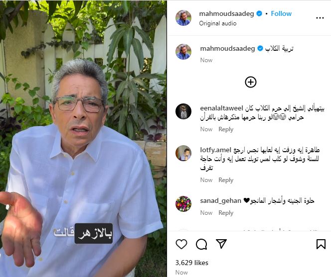 وتابع "سعد" أن من لم يربِّ كلاباً لا يستطيع أن يدرك مدى فائدتها، مشيراً إلى أنها تحميه. ودعا المتابعين إلى البحث والتحقق من آراء لجنة الفتوى بالأزهر ودار الإفتاء بخصوص حكم تربية الكلاب، مختتما: "ثم تعالوا وقولوا لي الكلاب نجسة ولا طاهرة."