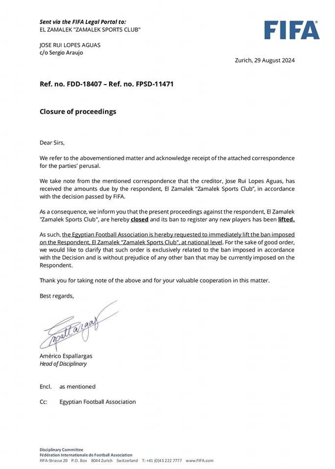 أرسل الاتحاد الدولي لكرة القدم فيفا، خطاب، يُفيد رفع إيقاف القيد عن نادي الزمالك بشكل رسمي، بعد تسديد الغرامات الموقعة على النادي المصري بسبب المستحقات المتأخرة لبعض من مدربيه ولاعبيه السابقين.