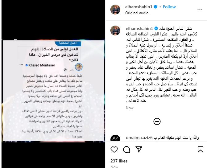 نشرت النجمة إلهام شاهين مقطع فيديو عبر صفحتها الرسمية "إنستجرام" عن تصريحها الأخير العمل أولي من الصلاة عبر اللقاءات التليفزيونية والتي هاجمها البعض بسببه .