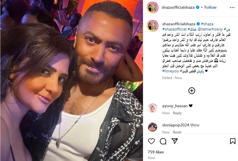 وشاركت شذي صورة تجمعها بتامر وكتبت عليها " من غير ما افكر واحاول ارتب الكلام انت اكتر واحد في العالم عارف حبي ليك قد ايه ، و اكتر واحد برضوا عارفني وعارف اني على الله حكايتي و دماغي بتسوحني كتير .